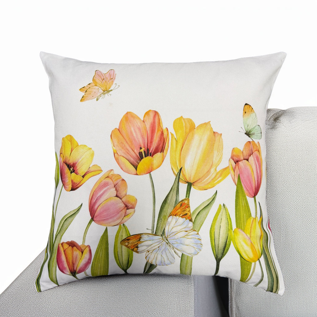 Embrace the spirit of spring with this seasonal table runner.Printed Tulips adorn this white fabric. A fine addition to any room. Available in different sizes.