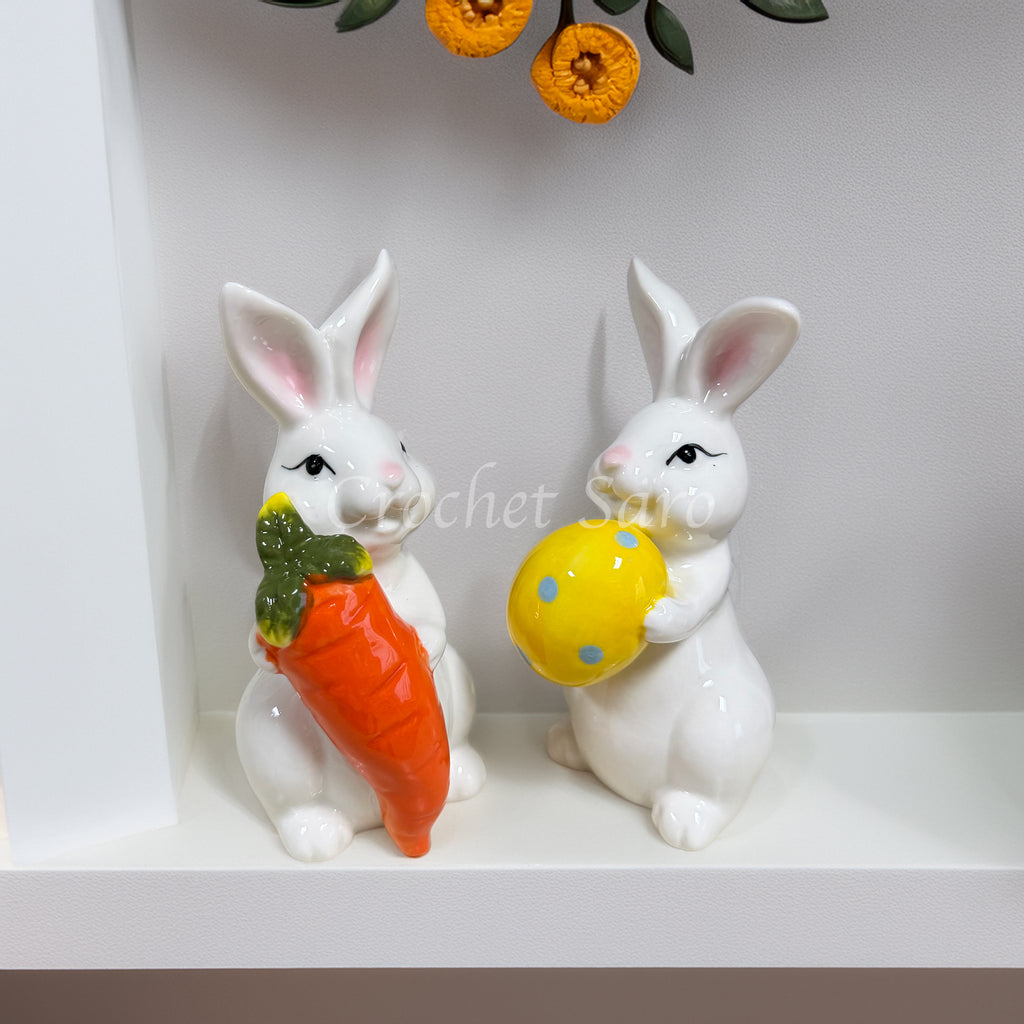 These white ceramic bunny figurines are commonly sold as Easter-themed home decor or collectible sets, featuring one holding a carrot and another holding a egg.